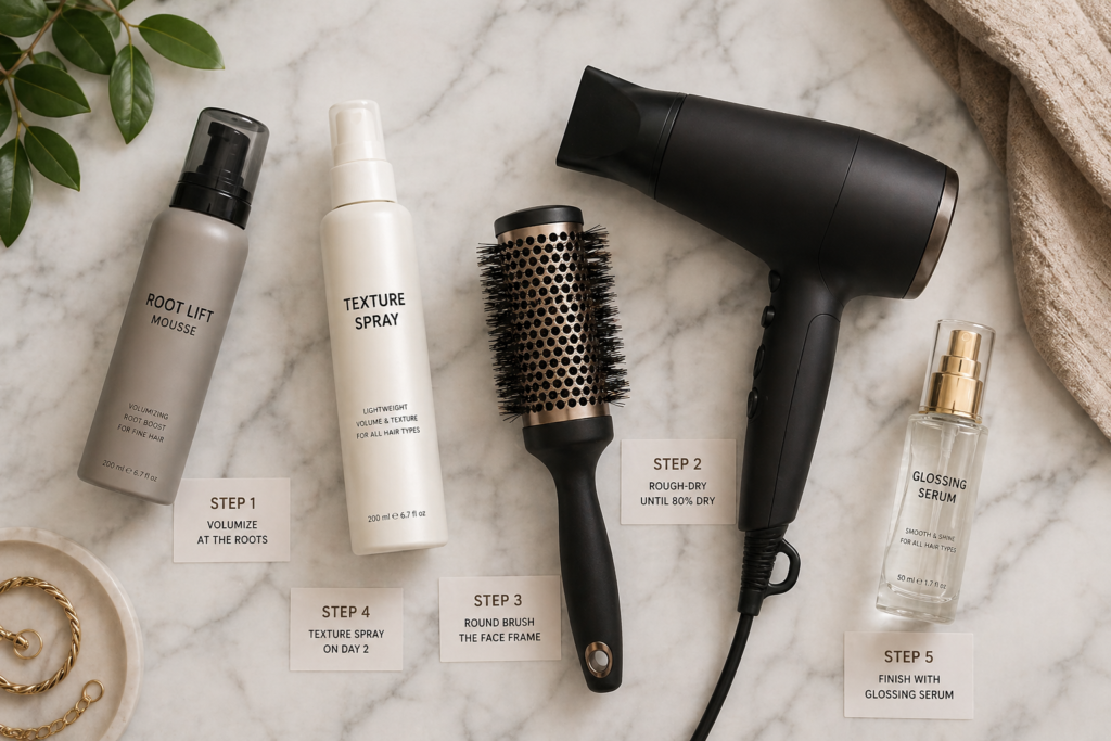 Step 5: Finish with a glossing serum on the ends only. Two pumps in your palms, focused exclusively on the mid-lengths and ends. Avoid the roots — it’s the fastest way to flatten thin hair.