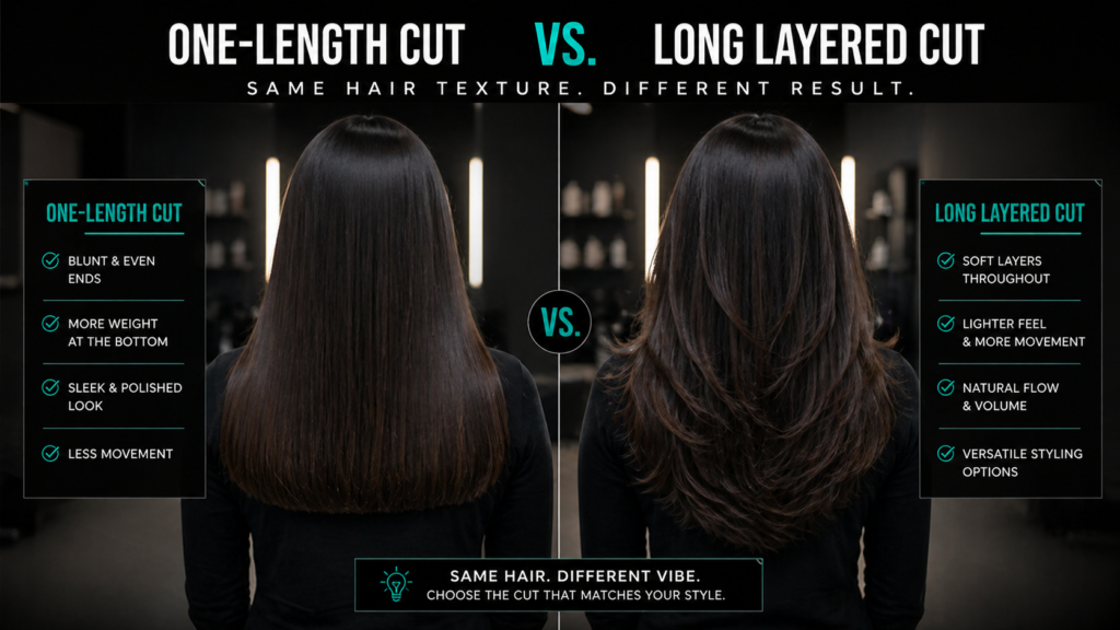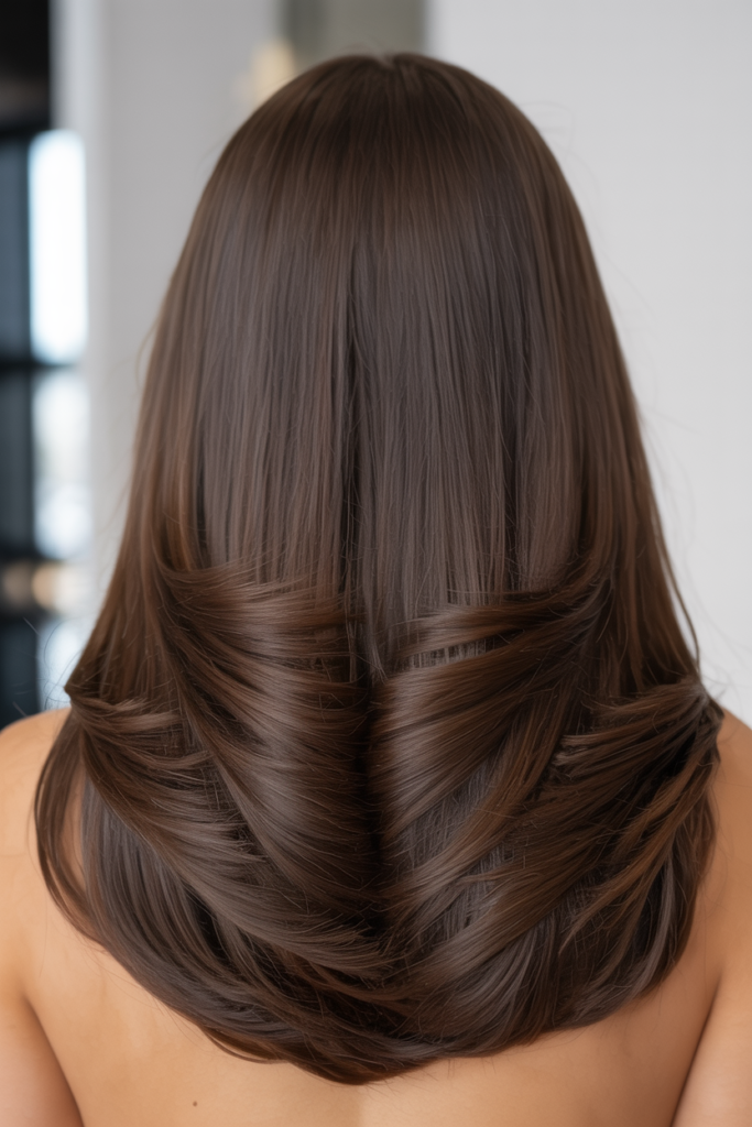 The V-cut keeps your length completely intact while adding subtle layers from the back. From the front, it looks one-length. From the back, it has a soft V-point with whispered layers framing the edges.