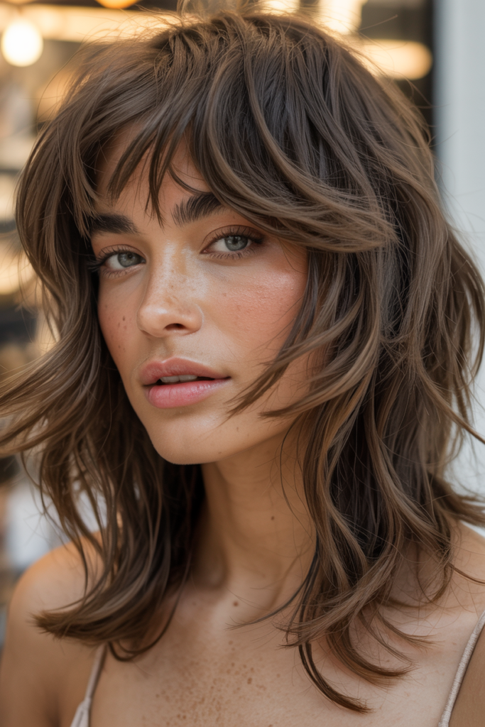 Who it suits: Square and oval faces; works on straight, wavy, and curly hair. Why it works for thin hair: The choppy texture creates dimension that fakes density. Quick tip: Ask for “soft shag” — not 70s rock-star shag — to keep it modern.