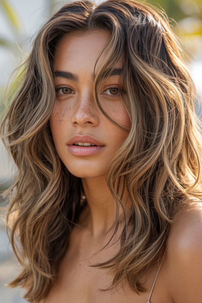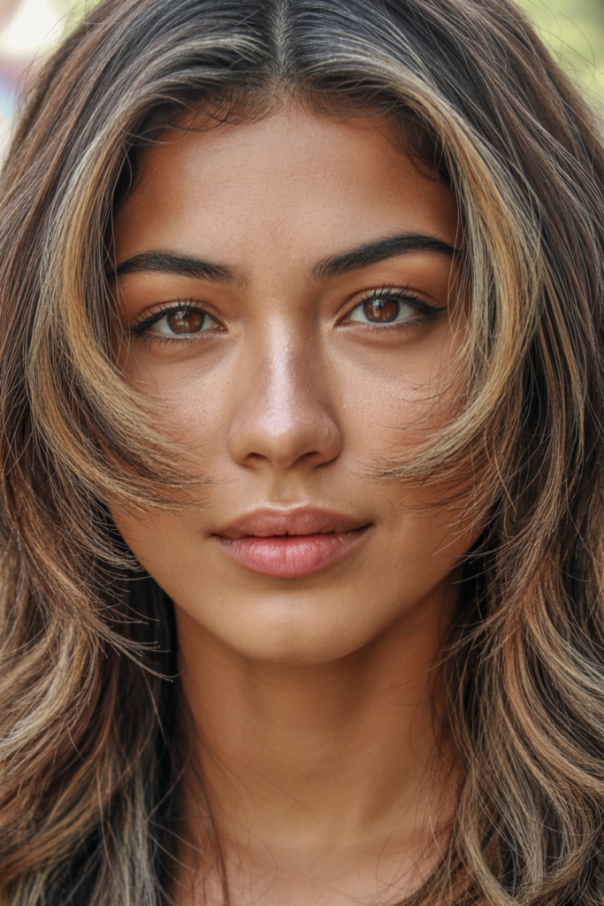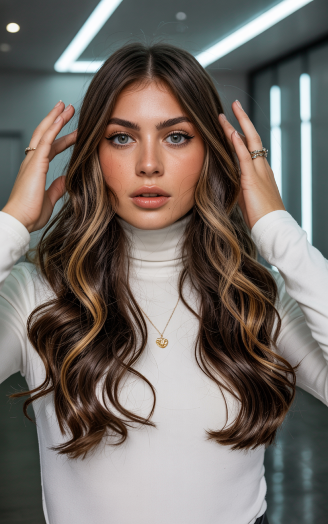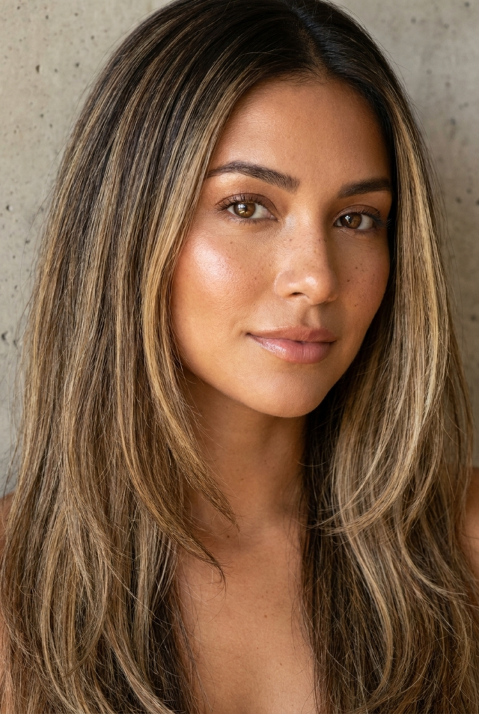 Not a cut alone — a cut + color combo that punches above its weight. Babylights (super-fine, baby-thin highlights) woven through long layers create a multi-tonal effect that reads as thicker hair.