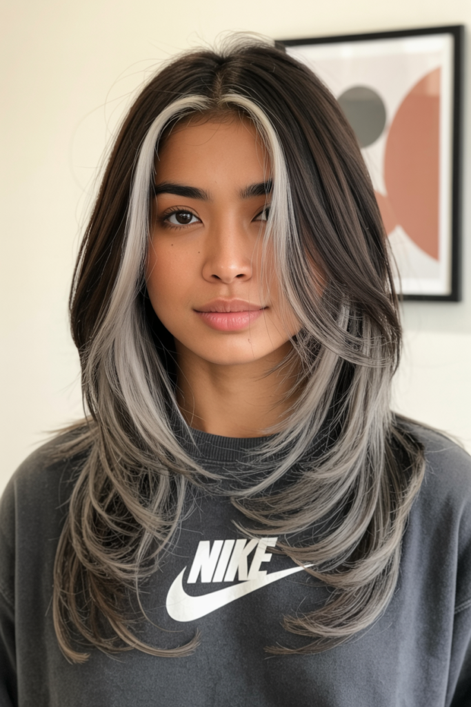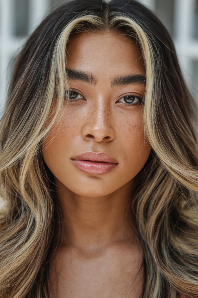 The “money piece” — those bright face-framing highlights — paired with long layers is borderline foolproof. The lightness near the face brightens your complexion and adds visual fullness even when there’s no real change in density.