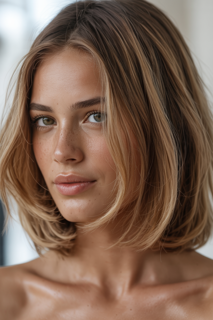 Who it suits: Round, oval, and square faces. Why it works for thin hair: Chin-length pieces draw the eye horizontally — wide reads as full. Quick tip: Tuck one side behind your ear for instant model-off-duty energy.