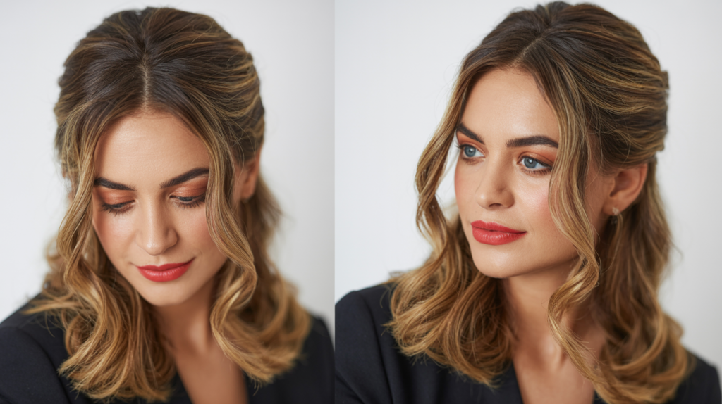 Who it suits: Everyone. Why it works for thin hair: Volume up top + flowing layers below = best of both worlds. Quick tip: Tease the half-up section before clipping for that “casual but lifted” look.