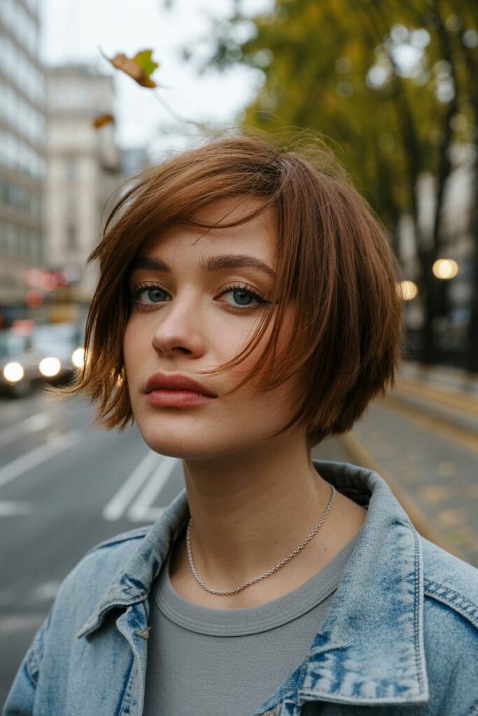 With edgy, short layers and bold side-swept bangs, this haircut strikes the perfect balance between playful and polished. The added volume at the crown gives it a trendy silhouette, making it ideal for anyone who wants an effortlessly stylish, personality-packed look.