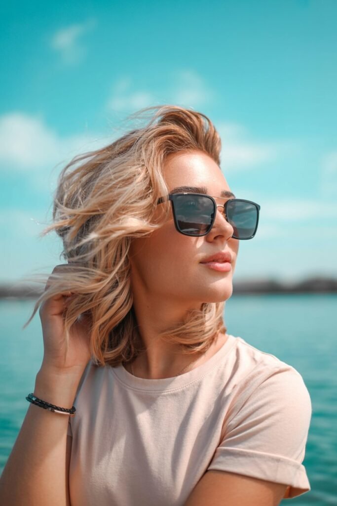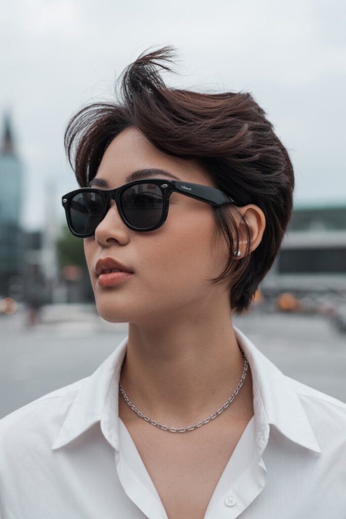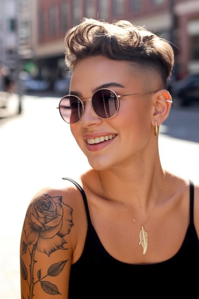 This fierce cut combines a clean undercut with textured layers on top for an effortlessly cool finish. Paired with round sunglasses and a laid-back tank, it delivers an urban tomboy vibe that’s stylish, self-assured, and easy to wear.