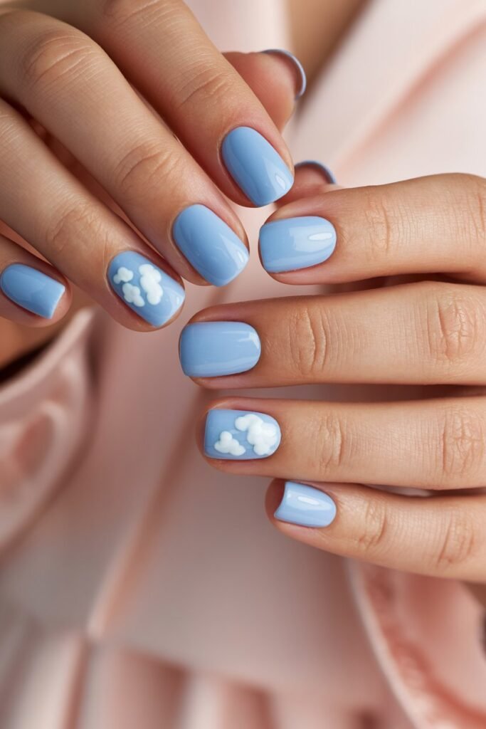 Sky blue is a dreamy, refreshing shade that feels like summer skies and lazy beach days. For a playful twist, paint one accent nail with a small design—like a white heart, sun, or cloud. It’s an easy way to add personality without going overboard.