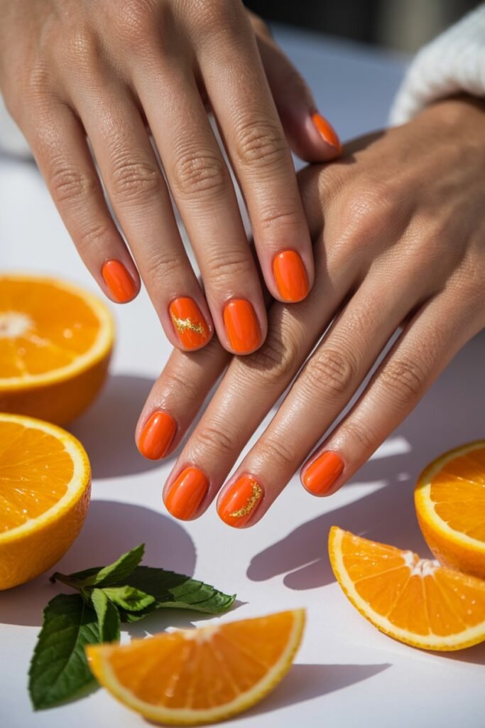 Whether you keep it solid or add a simple accent like a gold stripe or geometric shape, tangerine nails instantly brighten your look. They work especially well on short square or almond-shaped nails. For a little extra fun, match your mani with fruity accessories or a tropical print outfit.