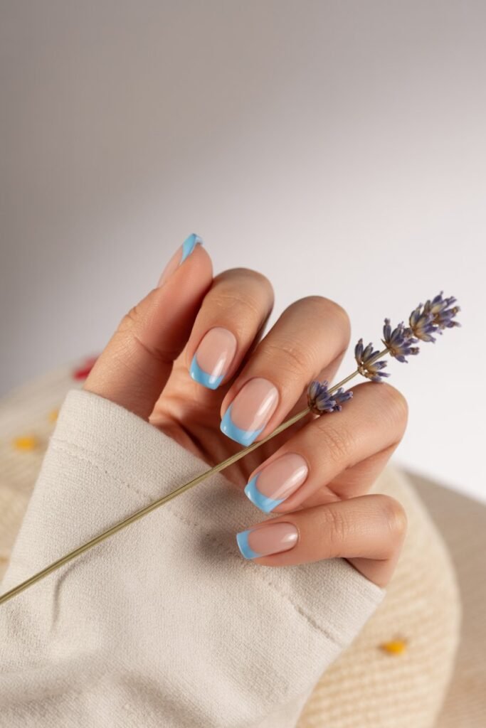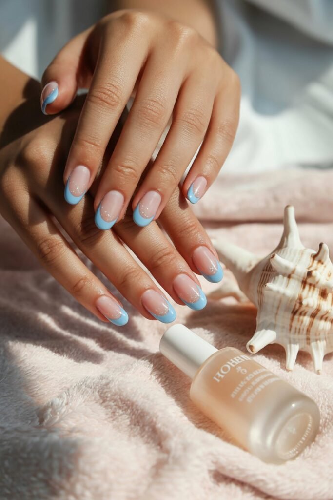 Put a playful spin on the traditional French manicure with baby blue tips. Instead of white, a pastel blue edge adds a cool, beachy vibe that feels perfect for summer getaways or lazy pool days.