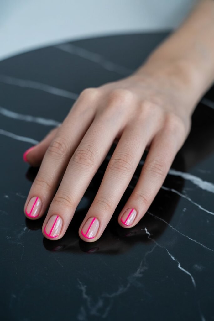 Strike the perfect balance between minimal and modern with a nude base and thin neon lines. Use hot pink, lime green, or electric blue to outline the nail or create delicate stripes. This contrast is sleek yet bold—letting your nails breathe while still turning heads.