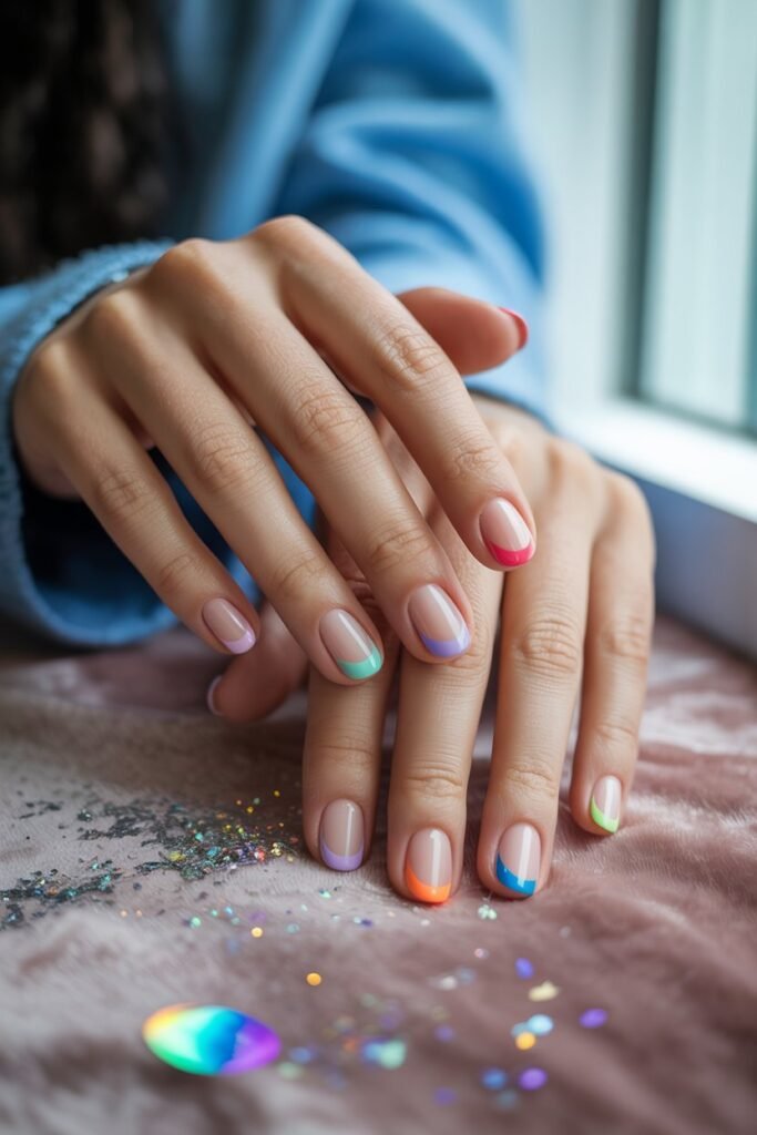Combine neutrals with playful color using a nude base and rainbow tips. Paint each nail tip a different shade—pastel or bold depending on your mood—and keep the rest of the nail bare or nude-toned. This style is fun, summery, and surprisingly wearable, offering a pop of personality without going overboard.
