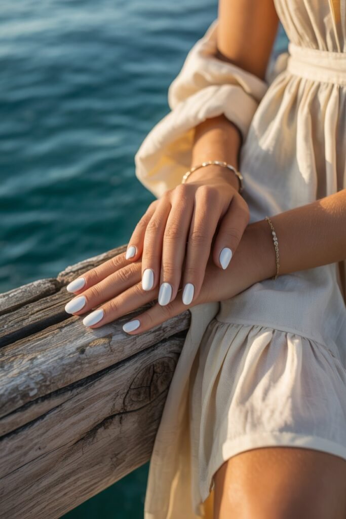Bright white nails are a summer classic for a reason. They’re fresh, crisp, and make your skin tone—especially with a tan—stand out beautifully. Whether you’re headed to the beach or brunch, white nails always look clean and stylish.