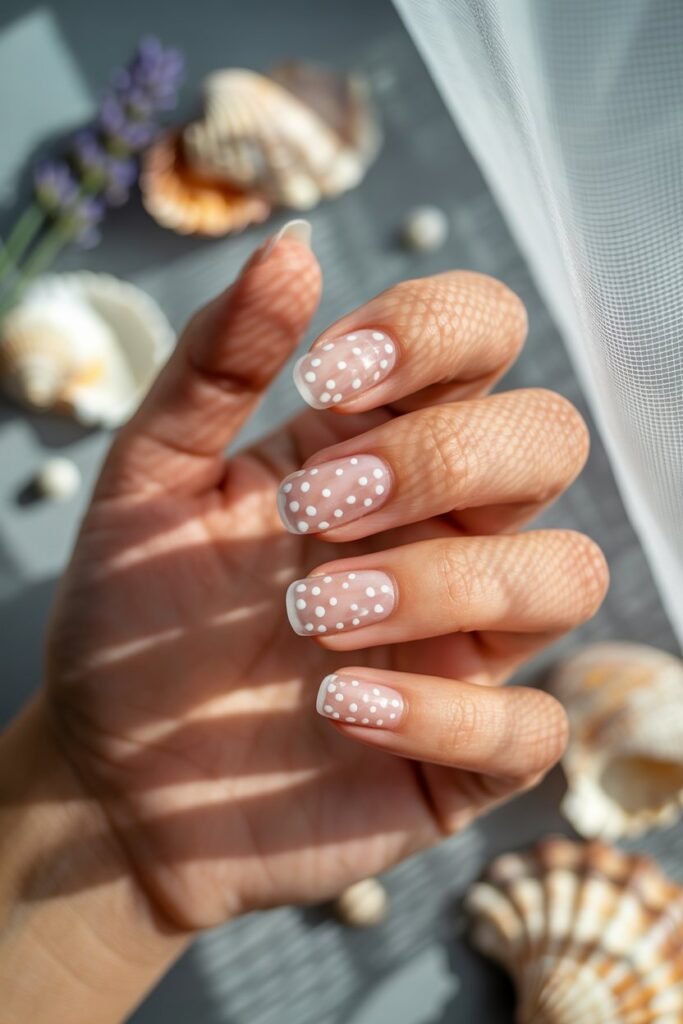 For a cute and minimalist manicure, try a clear or nude base with tiny white dots scattered across each nail. This design is whimsical yet polished, letting your natural nail show through while adding a hint of creativity.