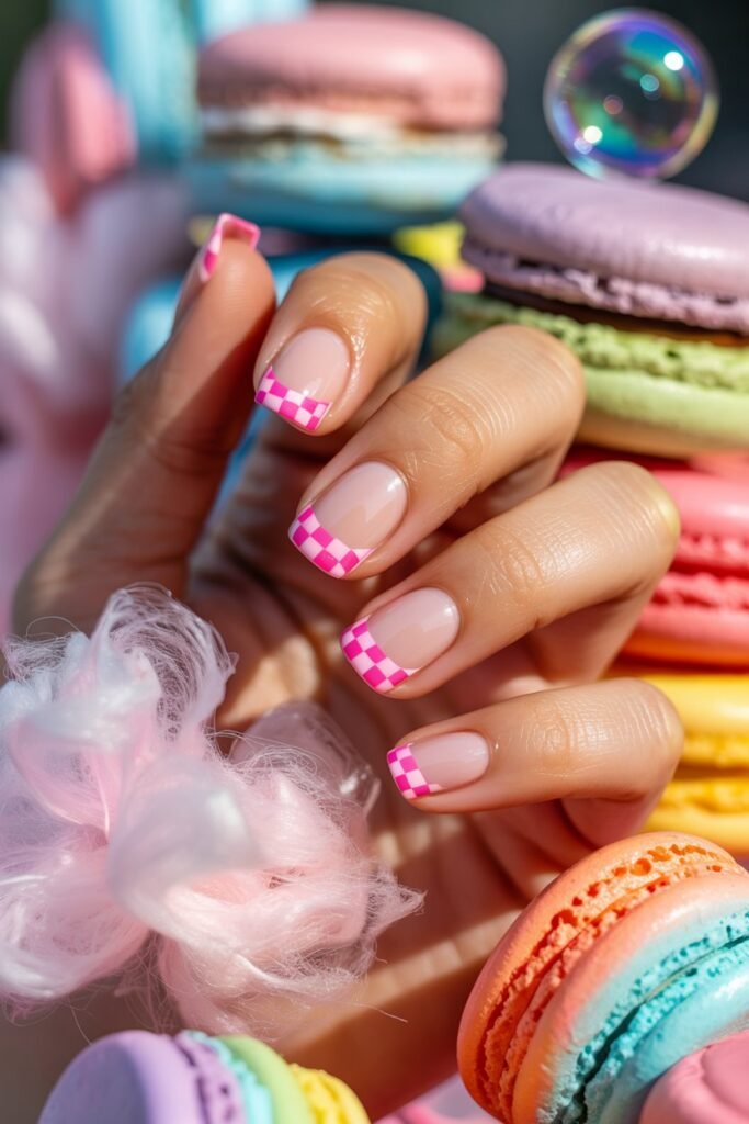 Looking for a design that’s trendy but not over-the-top? Pink and white checker tips are just the thing. This manicure keeps things simple with a neutral or clear base, while the mini checkered pattern on the tips adds a cute twist.